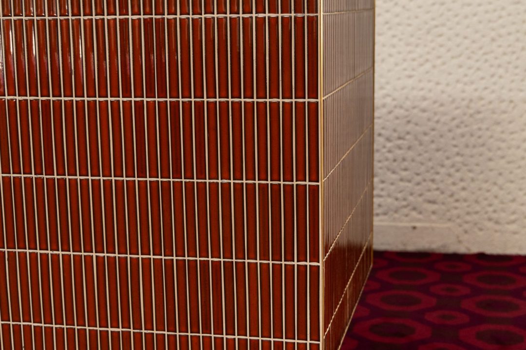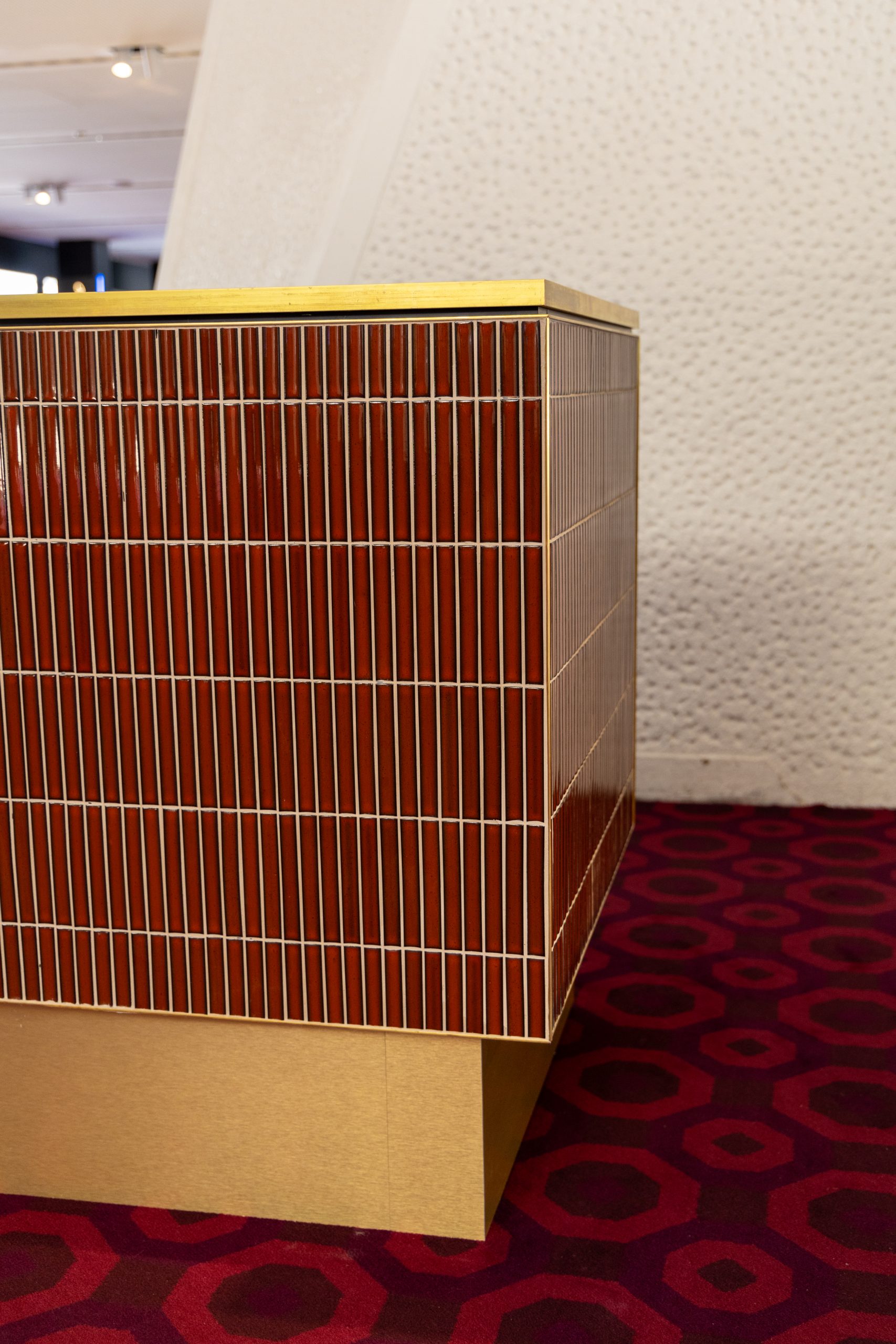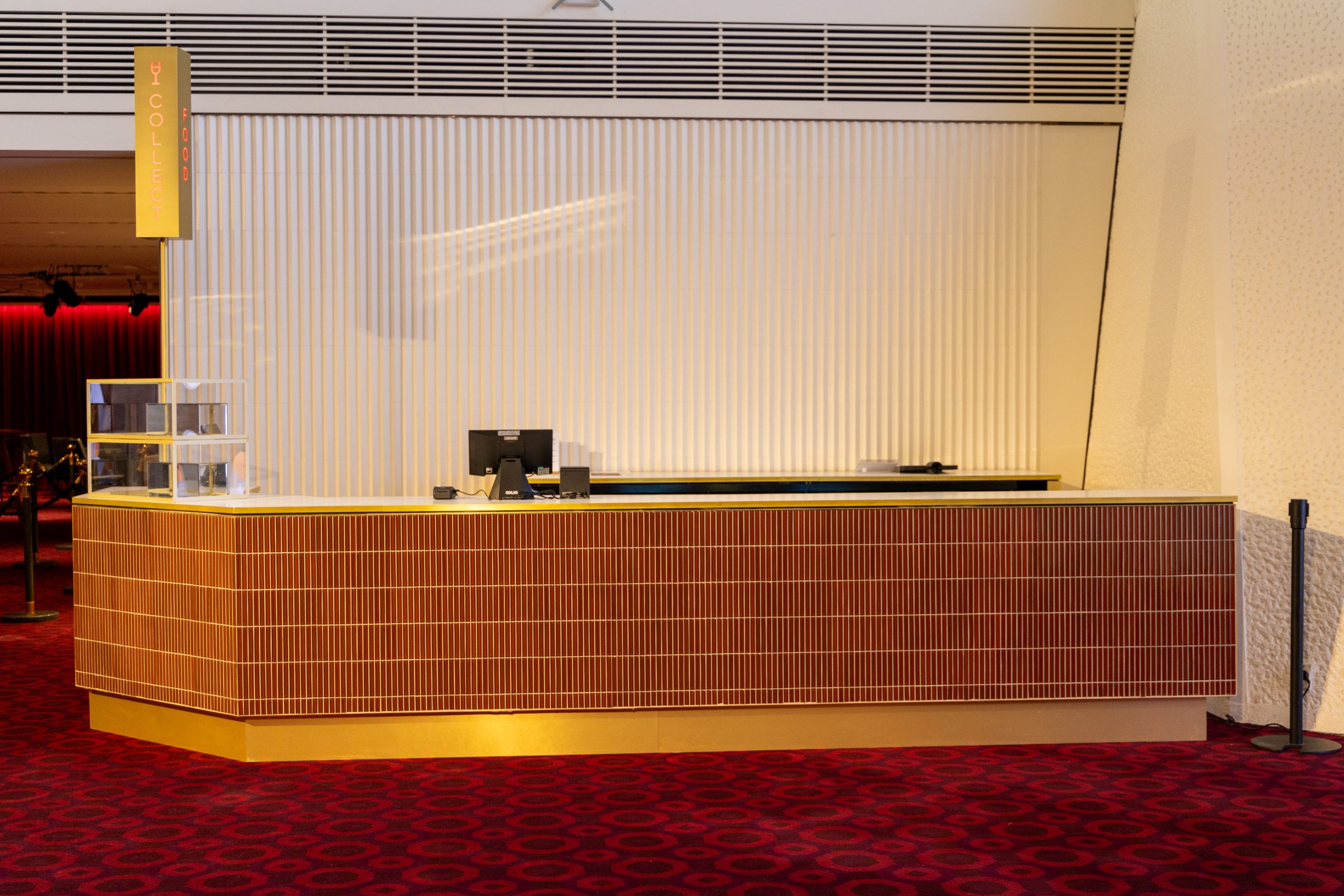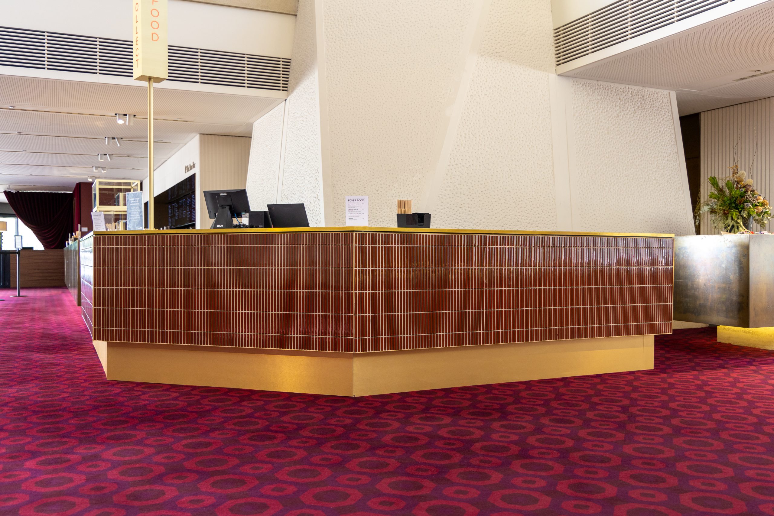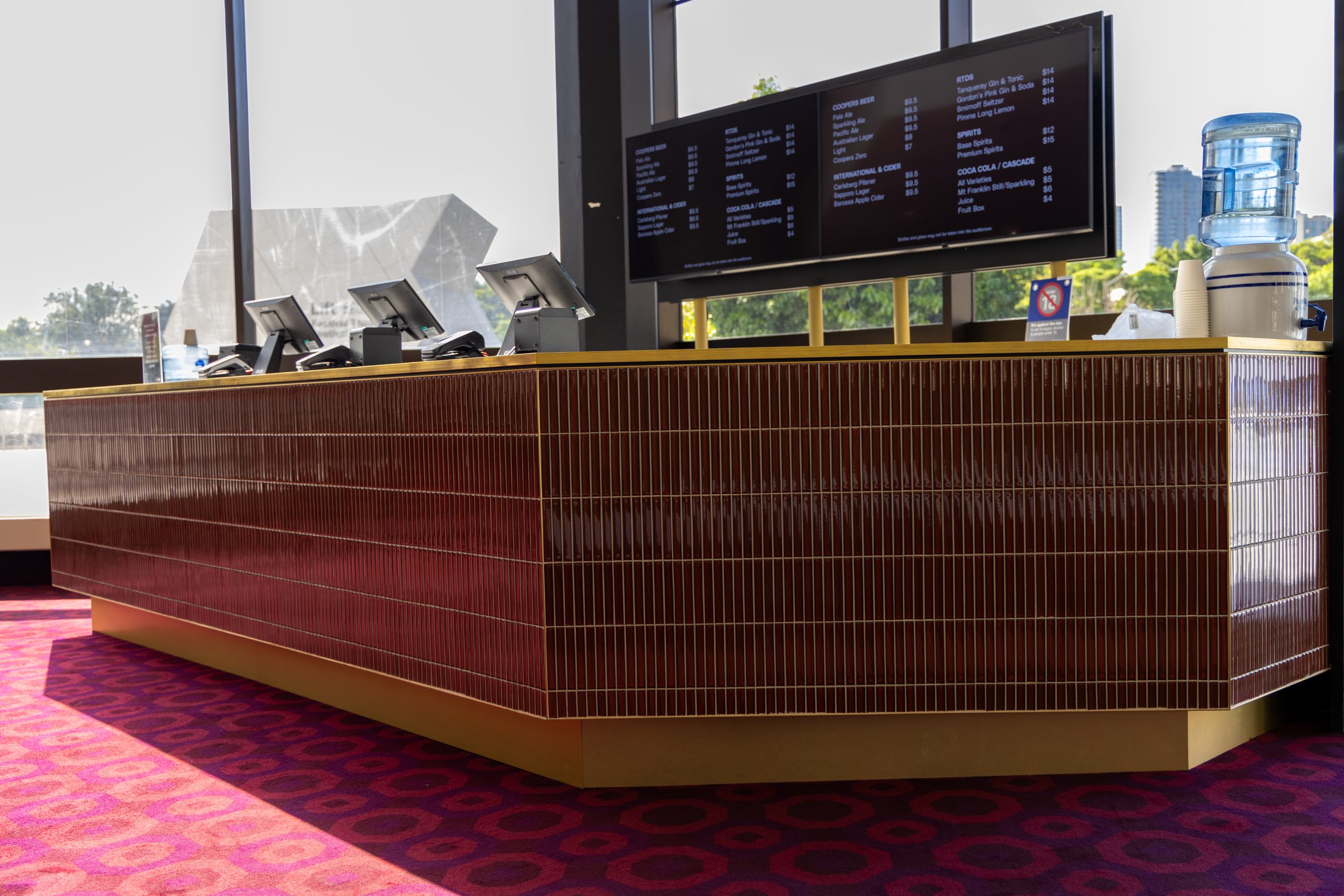 Each bar features a striking finish of glazed ‘Antique Terracotta’ finger tiles, adding texture and warmth to the façade. These are paired with elegant white marble benchtops, providing a durable and sophisticated surface for service. Brass edging details complete the build, introducing a subtle layer of refinement and tying the overall design together.
